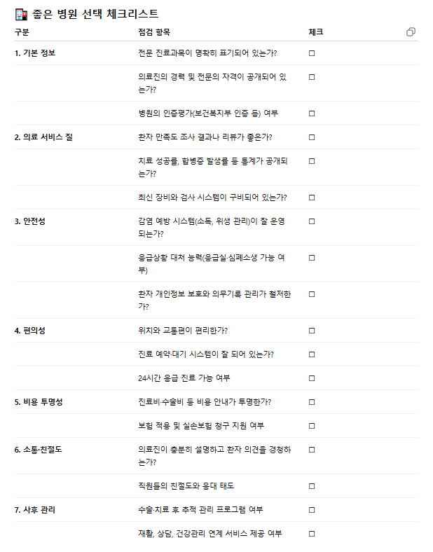 - 특히 중증 질환이라면 전문 센터나 경험이 많은 의료진이 있는 병원이 안전합니다.